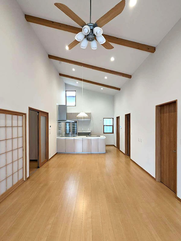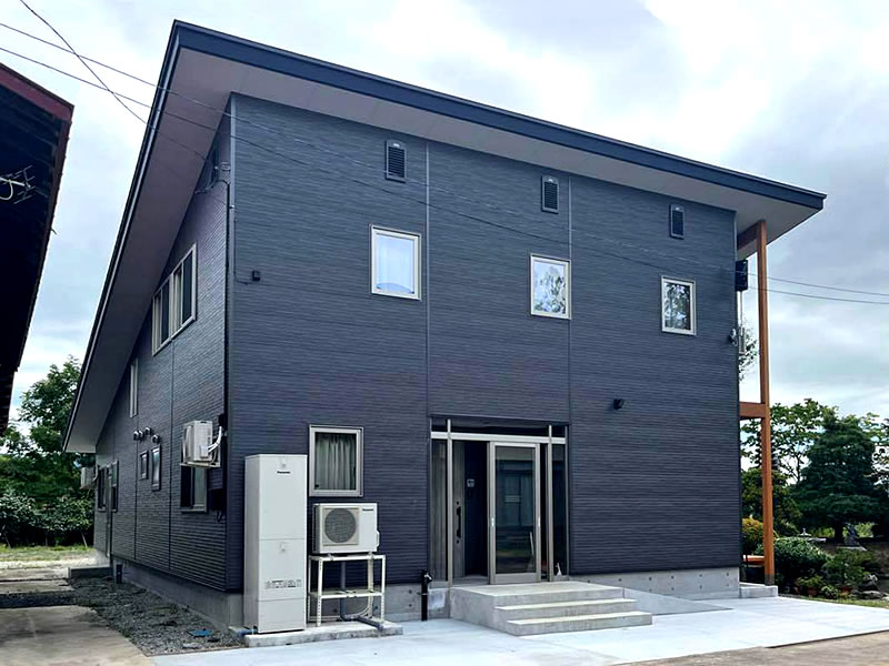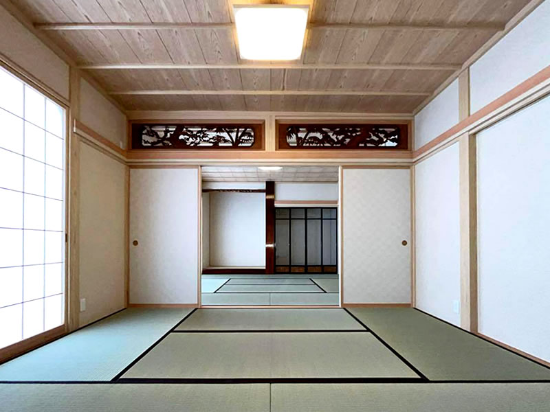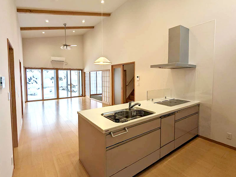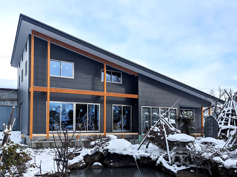 先人の思いをつないで、和室の床柱・彫刻欄間を再使用しました。 雪を考えた屋根の形とし、全室が暖かい家が出来上がりました。